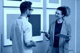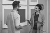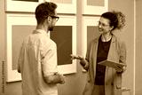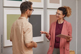 Young woman with digital tablet discussing modern art with man they standing at art gallery