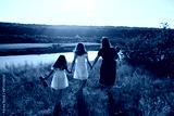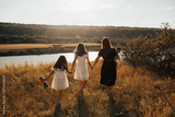 Beautiful family walking on the beach of river. Mom, two sisters and son enjoying leisure time in summer, talking, having fun together.