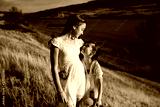 Two little sisters in white dresses. Girls having fun, smiling and hugging on the shore of the river.