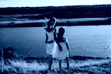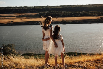 Back view of little girls looking at river and fields on summer sunny day. Having happy moments together looking at calm river, flowing among green fields and forest.