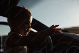 Smiling cheerful boy behind the wheel of the vehicle. Seven months baby having fun behind the steering wheel.
