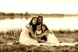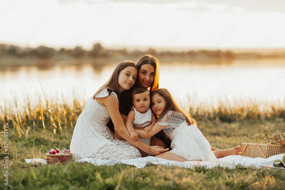 Happy family on summer picnic near river in sunny summer day. Summer vacation in nature. Family picnic on beach. Copy space.