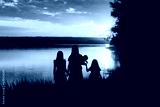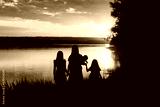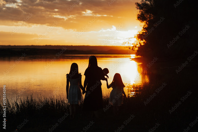 Young happy beautiful mother, her daughters and infant son on the beach at amazing orange sunset. Copy space.