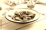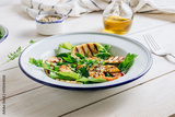 Grilled Halloumi Cheese salad with peach and arugula on a white wooden background. Healthy food concept.