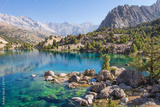 Tajikistan. Turquoise water in Alaudin lake. Beautiful view on rocky shore of lake in Fann mountains.