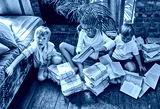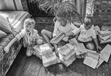 Children from one family learning and resting sitting on floor in kindergarten. Brothers having a good time together.