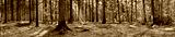 Panorama of a forest with a glade covered by moss in the light of the morning sun
