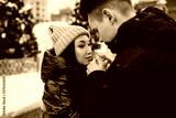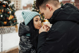 A young romantic tender couple wearing warm stylish clothes holding hands and warming up while standing in street in the city, enjoying spending time together.