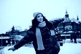 Beautiful smiling girl with hands up feeling happy while travel in Russia. Tourist girl posing on the background of the Kremlin. Travel in Russia concept.