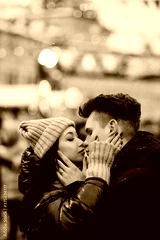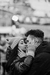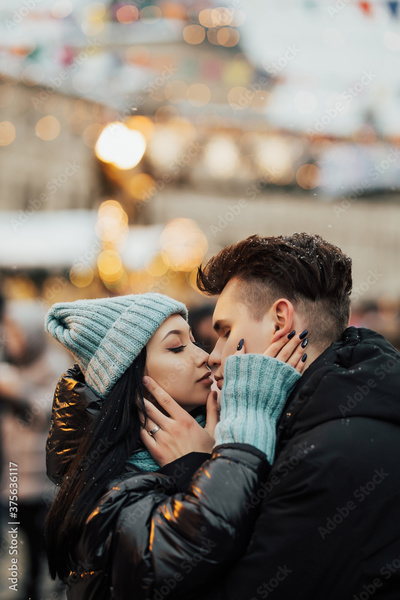 Passionate sensual attractive young couple, enjoying the company of each other at Christmas market. Close up portrait of romantic couple in love.