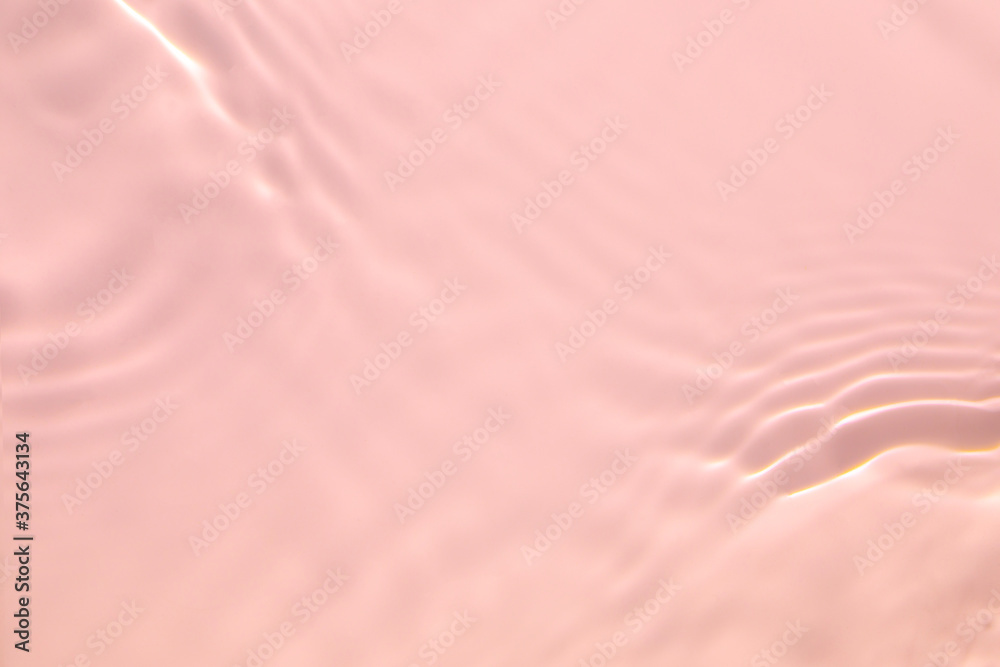 Closeup of pink transparent clear calm water surface texture with splashes and bubbles. Trendy abstract summer nature background. Coral colored waves in sunlight. Copy space.