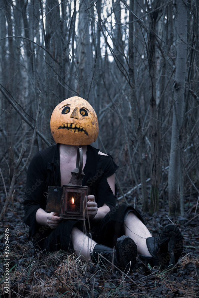 Lost in the woods a guy in a pumpkin with a lantern with a candle wanders in search of a means of getting rid of the autumn depression