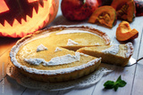Delicious homemade pumpkin halloween pie with carved Jack-o-lantern on the background. Orange cake with mint and sugar powder. Food photography