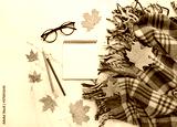 notepad, pencil, eyeglasses, autumn maple leaves and plaid. autumn still life, fall season concept. mock up. copy space
