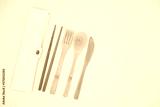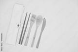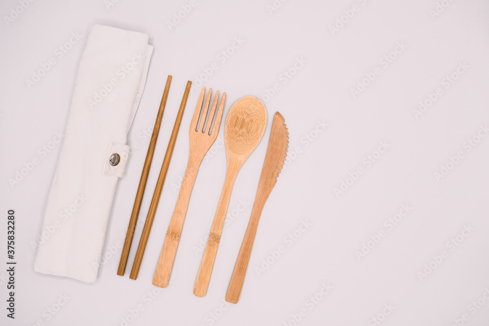 Eco friendly bamboo cutlery set isolated background. Zero waste concept. wooden travel cutlery set, copyspace, flatlay