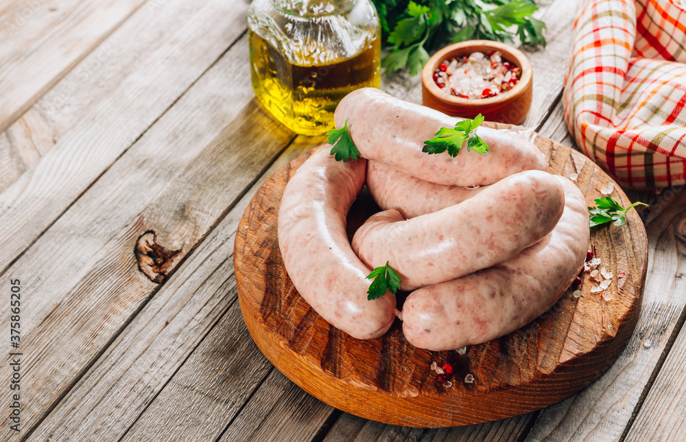 Raw chicken sausage for grilled on wooden cutting board with parsley.