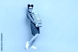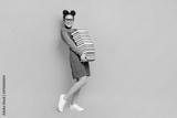 Full length body size profile side view of her she attractive cheerful cheery strong knowledgeable girl carrying book delivery isolated bright vivid shine vibrant yellow color background