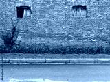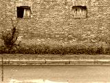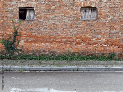 Weathered brick wall with worn windows, sidewalk with weeds and an asphalt road. Background for copy space.