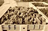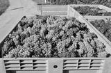 Bunches of white and red grapes freshly harvested in a large plastic bulk bin for processing food.
