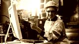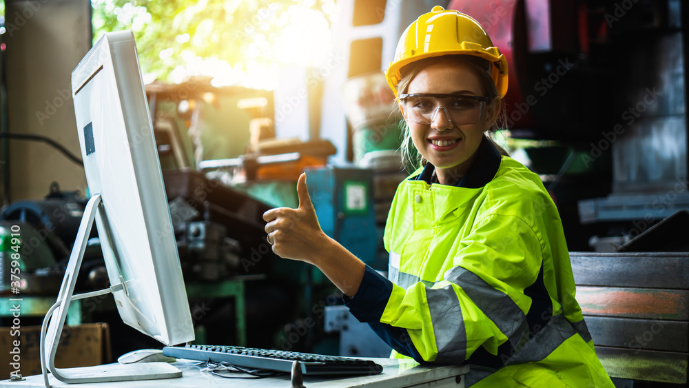 Woman work on computer inside the heavy industry factory, female industrial engineer works on personal computer show thumb up for OK after checking equipment