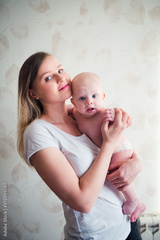happy mother with baby, lifestyle portrait at home, parenting with love and care