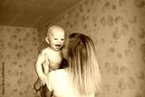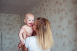 happy mother holdin son and laugh, lifestyle candid portrait at home