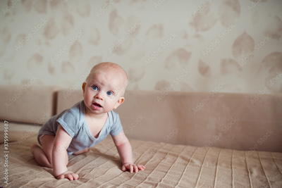 Cute happy and healthy 6 month baby boy on sofa, natural colours, home lifestyle