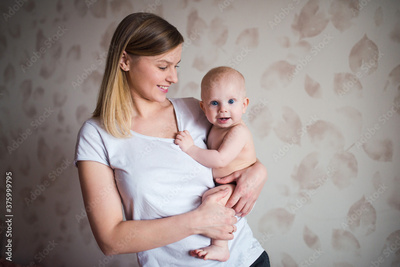 happy mother with baby, lifestyle portrait at home, parenting with love and care