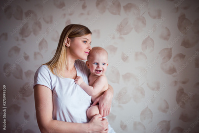 happy mother with baby, lifestyle portrait at home, parenting with love and care