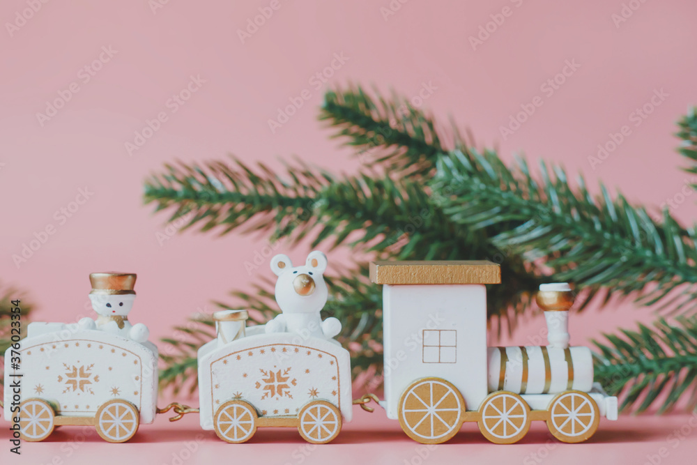 Christmas or New Year holiday greeting card. Toy's train on pink background.