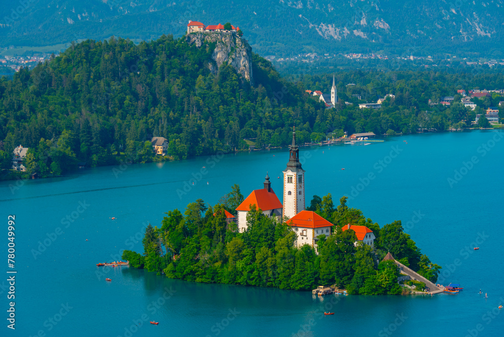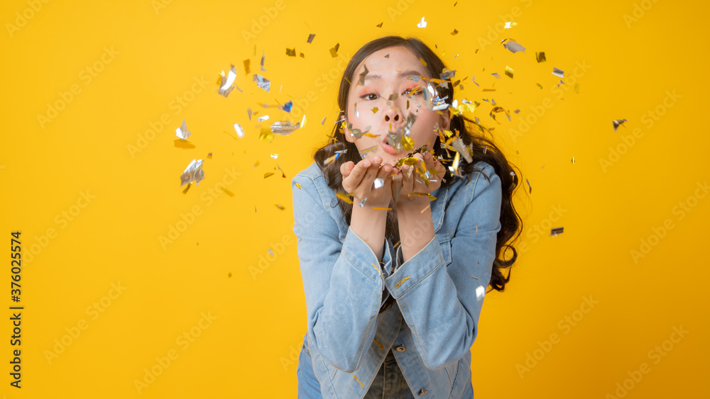 Beautiful happy woman celebrate and blowing golden confetti paper falling at celebration party on yellow background in studio