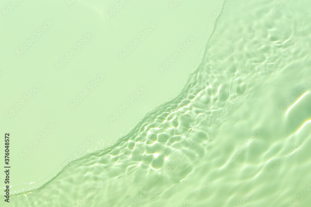 Closeup of mint green transparent clear calm water surface texture with splashes and bubbles. Trendy abstract summer nature background. Mint colored waves in sunlight. Copy space.
