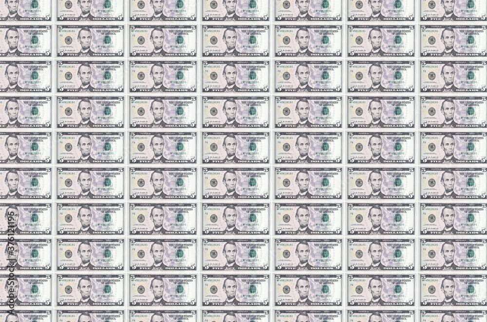 5 US dollars bills printed in money production conveyor. Collage of many bills. Concept of currency devaluation