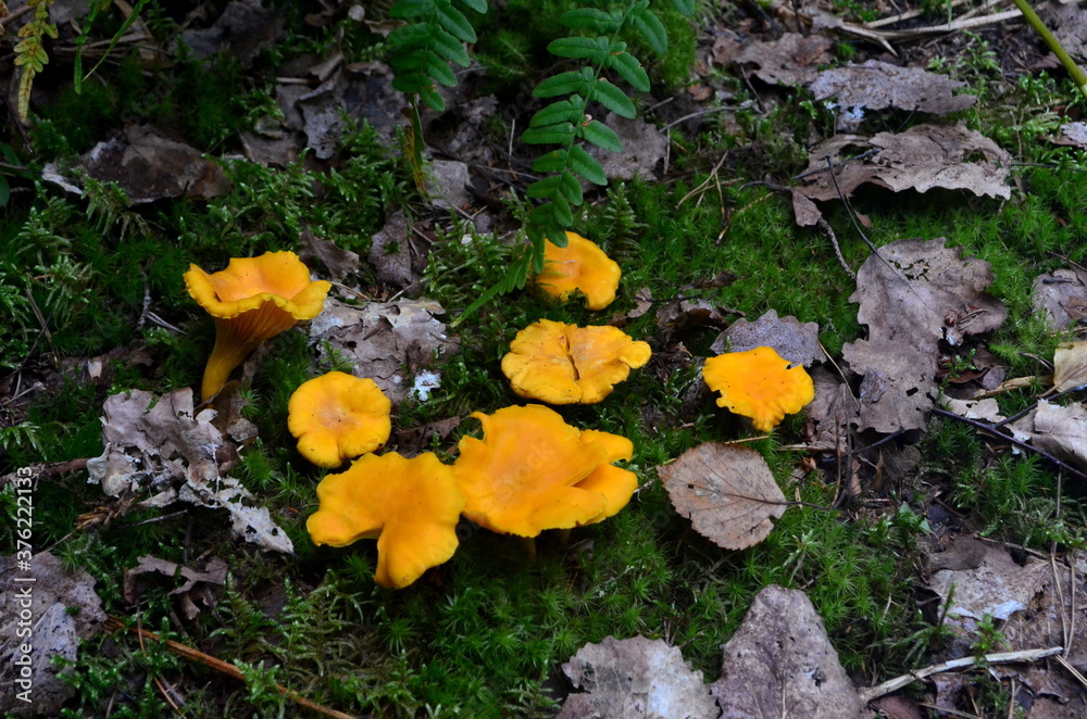 Wild golden chanterelle mushrooms in the forest. Edible autumn mushrooms