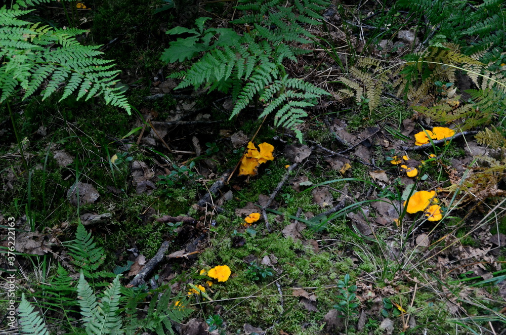 Wild golden chanterelle mushrooms in the forest. Edible autumn mushrooms