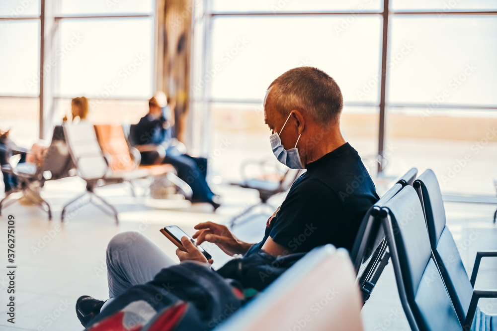 Airport attractive old man tourist boarding plane taking a flight wearing face mask. Coronavirus flu virus travel concept banner panorama.