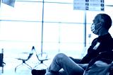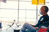 Airport attractive old man tourist boarding plane taking a flight wearing face mask. Coronavirus flu virus travel concept banner panorama.