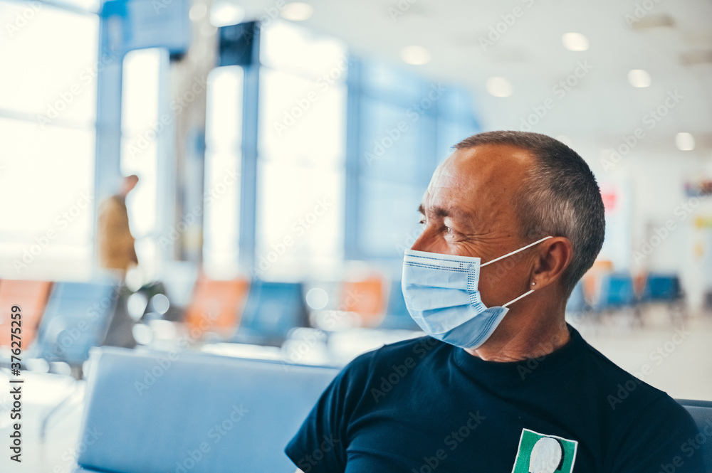 Airport attractive old man tourist boarding plane taking a flight wearing face mask. Coronavirus flu virus travel concept banner panorama.