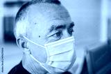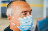 Airport attractive old man tourist boarding plane taking a flight wearing face mask. Coronavirus flu virus travel concept banner panorama.