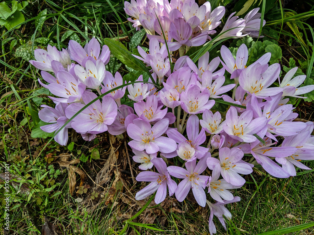 a clump of pink wintergreen flowers growing in a natural environment against the background of green grass and leaves of other plants