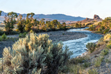 Rock outcropping over the river with trees and shrub on the banks and mountain in the background, South Fork Shoshone River, Cody, Wyoming
