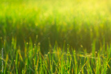 Blur green rice paddy field. Fresh green grass field with raindrops. Water drops on green rice leaves in farm. Green grass leaves with bokeh background and sunlight. Nature background. Rainy season.