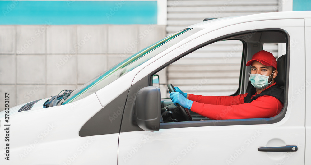Delivery man driving a van during coronavirus outbreak - Courier wearing face protective mask and gloves for Covid 19 spread prevention