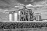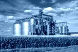 Modern Granary elevator. Silver silos on agro-processing and manufacturing plant for processing drying cleaning and storage of agricultural products, flour, cereals and grain.