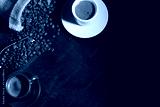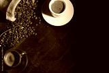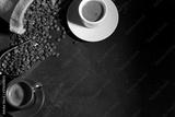 Two espresso cups, coffee beans, metal scoop, burlap bag on black table background with copy space. Arabica grains, top view. Coffee shop, caffeine, hot drink concept