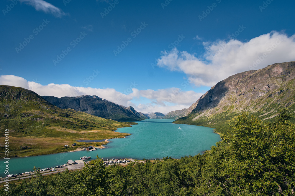 wiev of gjende lake ferry from the besseggen trail hike in the Jotunheimen national park norway mountains
