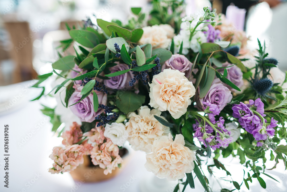 Orange carnation, violet roses and greenery in the floral centerpiece, wedding bouquet, decorative floral composition, frontview, beauty of flowers, romantic gift on the first date