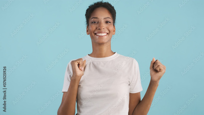 Beautiful African American girl rejoicing on camera over colorful background. Happy expression