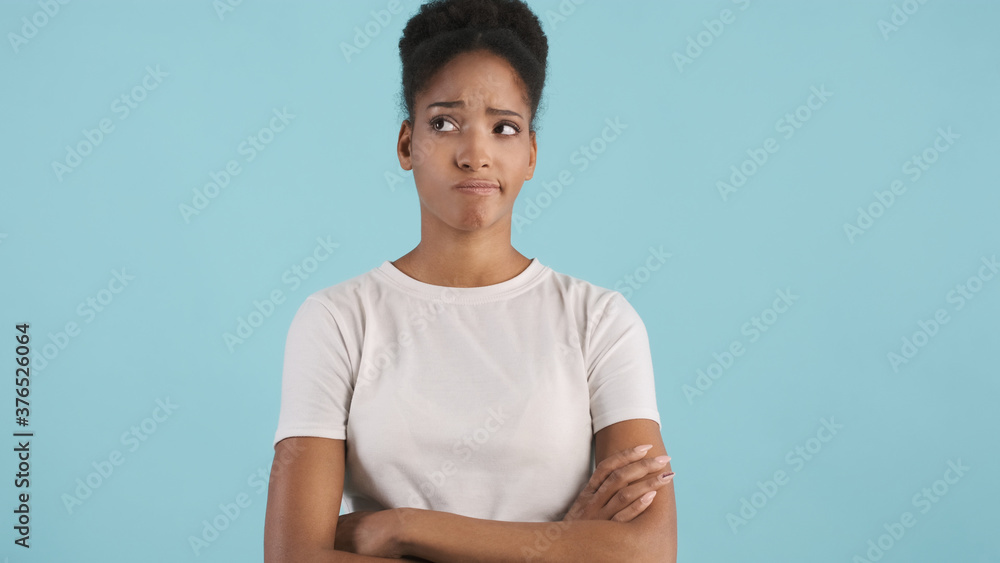 Upset african american girl holding arms crossed thoughtfully looking aside isolated
