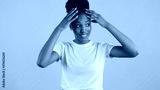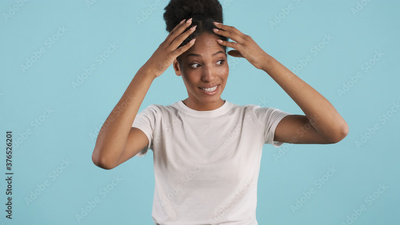 Portrait of tired casual african american girl emotionally posing on camera over blue background